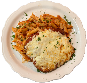 Breaded Chicken Breast Baked with Tomato Sauce & Mozerella. Served with penne in Tomato Sauce